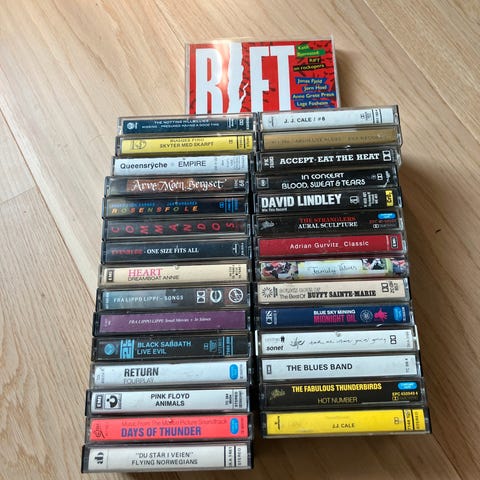 En samling av musikkassettbånd med ulike artister og sjangere.