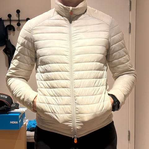 jakke i beige farge for herre. Jakken har en myk og varm tekstur, egnet for utendørs bruk. Materialet og detaljer er tilpasset komfort og funksjonalitet.