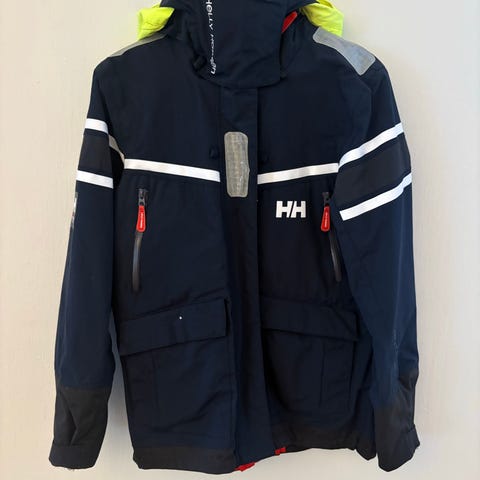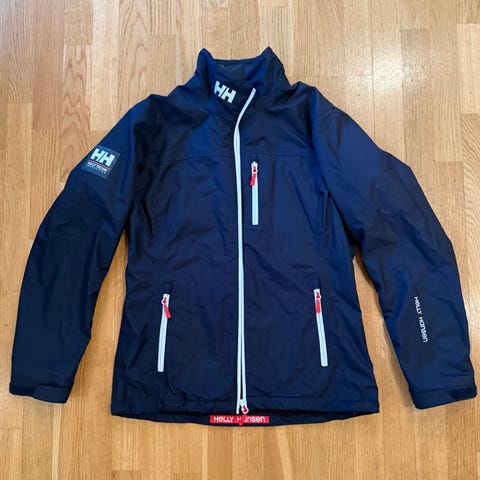 Helly Hansen Crew Sailing Jacket 2.0 damejakke i marineblå farge. Jakken er laget for seiling og har tekniske egenskaper som beskytter mot vær og vind. Størrelse L/G (normal passform). Lite brukt pga feil størrelse. Jakken er påtrykket reklamemerker og selges derfor veldig billig, ny pris er 1999kr