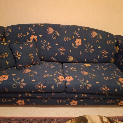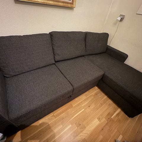 Sofaen er i god stand, kun sovet i 2 ganger og stått på gjesterom. Lilla stoff med litt struktur. Er et lite merke på en av sidene. (Se bilde). Liggeklengden er 200 cm med god liggekomfort.