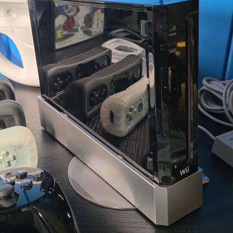 Spillkonsoll i god stand og med sensorplanke, strømtilkobling og tv tilkoblingsledninger (lite deksel foran mangler - se bilder). Det følger også med stativ for å ha konsollen «stående».