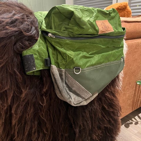 Selger norskproduserte kløv til hund. Kun brukt et fåtall ganger til riesenschnauzer. Gjetter på at størrelsen er rundt 20l. Slitesterkt og av god kvalitet. Tilsvarende ser i dag ut til å ligge på rundt 3000,- i pris.