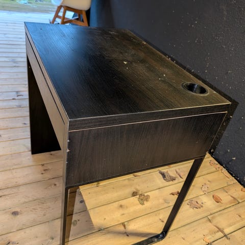 Selger et godt brukt skrivebord med kontorstol. Trenger litt kjærlighet for å bli fint igjen.