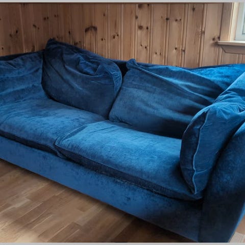 Tøff sort følyels sofa trukket med nagler rundt i rammen, veldig god å sitte og ligge på.
