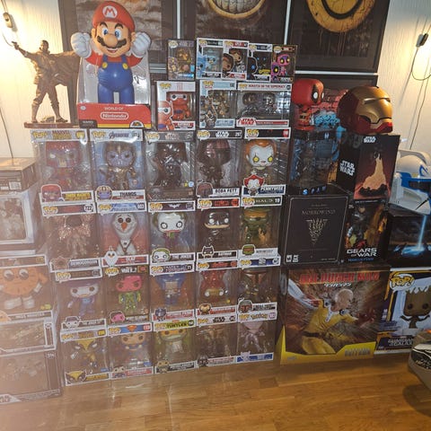 Samling av Funko Pop! figurer inkludert Marvels Captain Marvel, Thor, DCs Batman, og Star Wars karakteren Chewbacca. Figurene kommer i original emballasje med ulike spesialutgaver som Chase og Limited Edition.