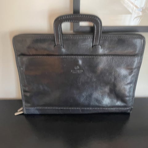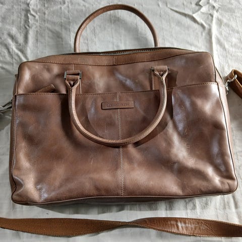 Skinnet har utviklet en vakker, naturlig patina som gir et eksklusivt og profesjonelt uttrykk. God plass til laptop og dokumenter, og passer perfekt til jobb, møter og reise.