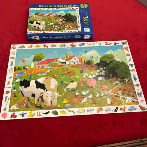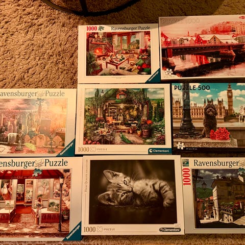 Ravensburger og Clementoni puslespill i ulike størrelser og motiver. Puslespillene inkluderer sett med 24 og 54 brikker, egnet for barn. Motiver inkluderer biler, dyr, og tegneseriefigurer.