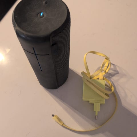 Ultimate Ears UE Boom trådløs høyttaler med flerfarget design. Bærbar og kompakt enhet med kontrollknapper på toppen og tilkoblingsporter på undersiden. Egnet for trådløs lydavspilling via Bluetooth.