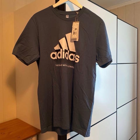 Selger en mørkeblå Adidas T - skjorte i str L. T - skjorten er ikke brukt, prislapp henger på. Ingen flekker, slitasjer eller hull. Klassisk Adidas design som passer både til hverdagsbruk og mer avslappet stil.