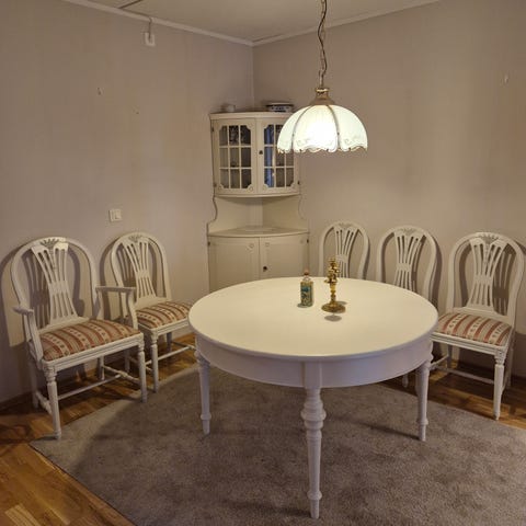 Godt brukt spisebord med seks stoler. En del bruksmerker, men kan fint males/slipes. Trekk på stoler kan tas av og trekkes enkelt om.