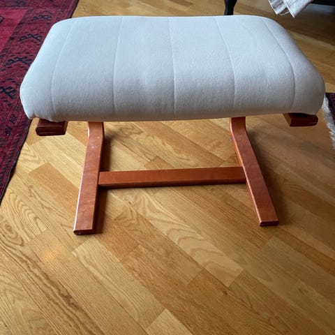 Puff med oppbevaringsplass gis bort. Trekket på putedelen er slitt og har hull. Trekket på selve puffen trenger en vask.