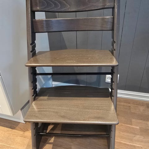 Stokke høy barnestol i rød farge. Laget i tremateriale.
