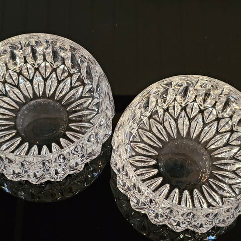 Dekorasjon sett: vase/lysestake i krystall, håndheklede brikker til oppheng