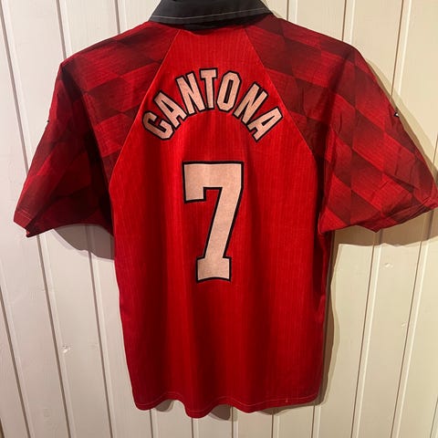 Selger en nydelig Manchester United bortedrakt fra 1993-1995-sesongene i størrelse large. Dette er selveste "Kung fu"-drakta, selvfølgelig med kongen selv på ryggen, nemlig "Cantona 7". Drakten har i tillegg "Champions 93/94"-patcher på ermene.