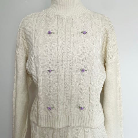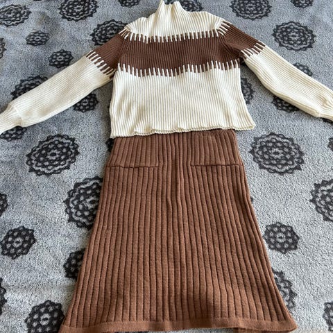 Kult vintage/ retro strikket sett med vest, skjørt og genser. Ull. Antas laget i Norge på 1970 tallet, kanskje tidlig 1960-tallet. Ull. Ikke merket inni med størrelse, passer meg som bruker S til M, selges helst samlet ,men kan deles til skjørt og best sammen og genser for seg om ønskelig. .prisforslag mottas