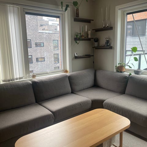 Grå, nett hjørnesofa med sjeselong. Nesten ubrukt uten bruksmerker. Solid stoff og behagelig sittekomfort.