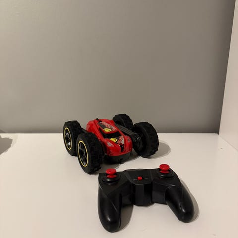Håndlaget LED-barneromslampe. Tilsvarende som Little Lights lampe. Designet som en racerbil med rød farge og detaljer som hjul og nummer 7 på siden.