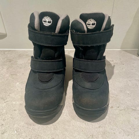 Timberland barne vinterstøvler i størrelse 34, Støvlene har svart farge og er laget med materialer som gir varme og beskyttelse mot vinterforhold. De har borrelåslukking for enkel på- og avkledning, samt en robust såle med godt grep. Brukt en vinter. Ny vasket og impregnert. Klar til bruk:)