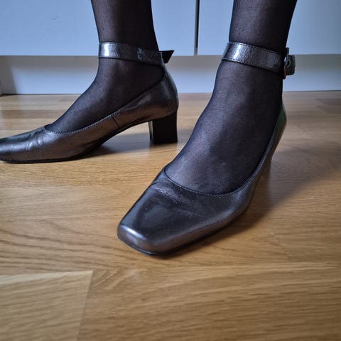 Skolettene er i semsket skinn. Hælen er kledd med pelsaktig skinn.