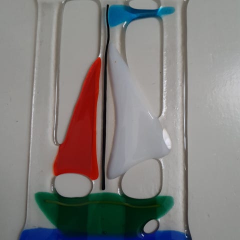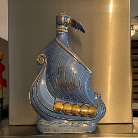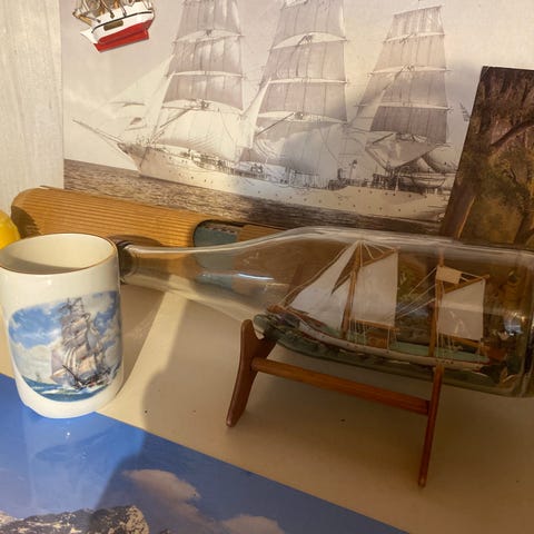 Skipsmodell i flaske med trestativ. Modellen viser et seilskip med detaljerte seil og rigging, plassert inne i en glassflaske. Trestativet har en navneplate med teksten "Statsraad Lehmkuhl". Passer til dekorasjon eller samling.