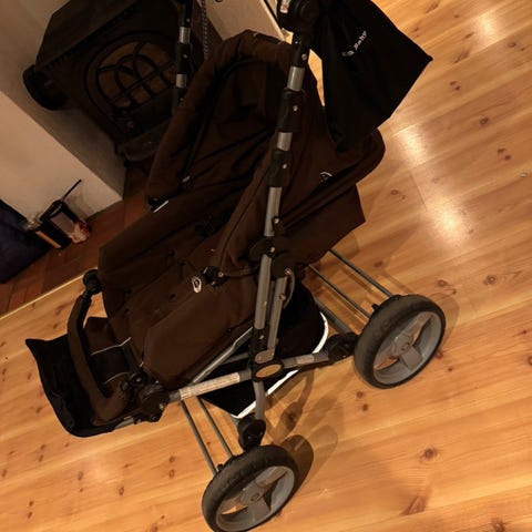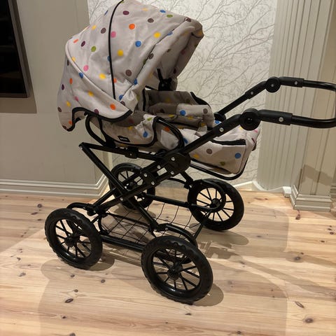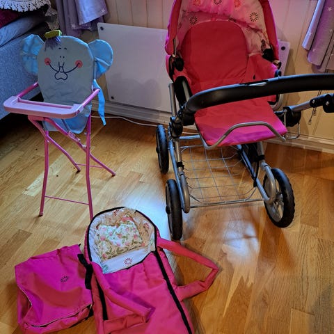 Dukkevogn, dukke, stellebord, vogn, bilstol, potte og pose med hjemmestrikka dukkeklær selges samlet.
