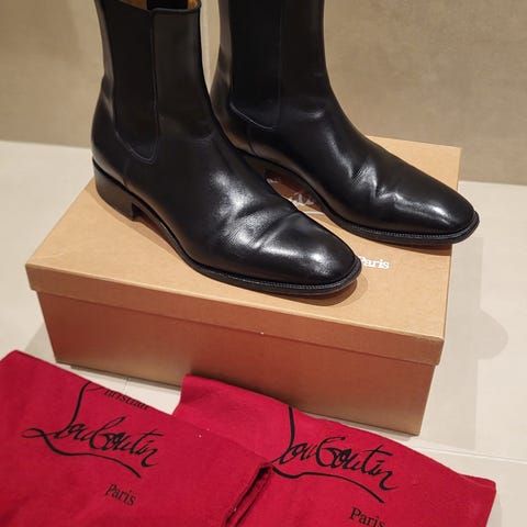 Valentino støvler i størrelse 44, laget av svart skinn. Støvlene har en robust såle med godt grep og elastiske sidepaneler for enkel på- og avkledning.