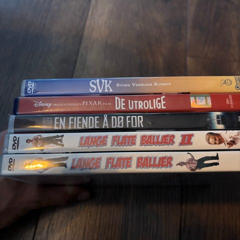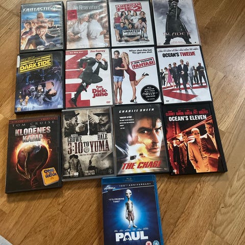 Samling av DVD-filmer , inkludert The Walking Dead, Mission Impossible, Ocean's Twelve, The Expendables 2, Sherlock Holmes, Kon-Tiki, mot i btøstet , Futurama og fler