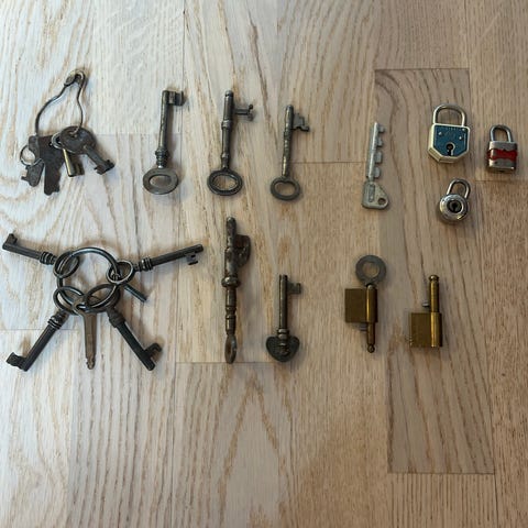 vintage lot, småantikviteter, gamle nøkler, skjelettnøkler, apotekflaske, glassflasker, zanker, metallskilt, hengelås, trebokser, samlerobjekt, retro interiør