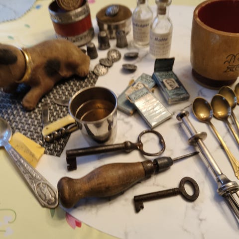 Selger en samlet LOT med vintage husholdningsartikler og små samleobjekter med tydelig historisk preg. Perfekt for samlere, dekor, interiør eller rekvisitter. Selges kun samlet som lot.
