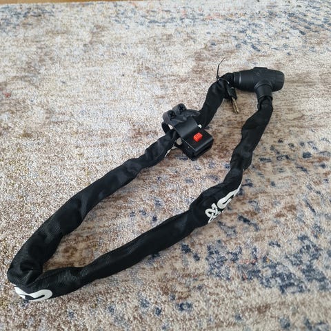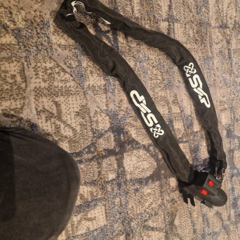 Sykkellås med kjede og lås. Nøkkel er dekket med svart tekstil for å beskytte mot riper. Låsen har en nøkkelfunksjon med rød knapp for sikker åpning.