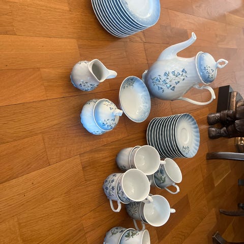 Bing & Grøndahl kaffestel med nissemotiv, bestående av kaffekanne, kopper og serveringsfat. Produktet har hvit farge med dekorative nisseillustrasjoner. Egnet for bruk ved servering av kaffe.