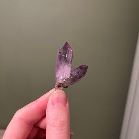 Ametyst krystallstein med lilla og hvite krystallstrukturer. Naturlig mineral med uregelmessig form og størrelse som vist på bilder. Kan brukes til dekorasjon eller samling.