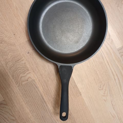 Stekepanne med grillrist, diameter 28 cm, utstyrt med treskaft. Egnet for grilling og steking av mat, gir grillmønster på maten. Materiale for stekepanne og håndtak ask.