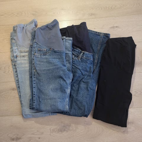 Bukse 1 er i denim. Et lite hull i sømmen på graviddelen, men fungerer som den skal. H&M. Super skinny high rib mama Str L.