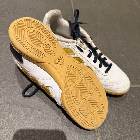 Adidas innesko i hvit med svarte detaljer. Skoene har en solid gummisåle med mønster for godt grep.