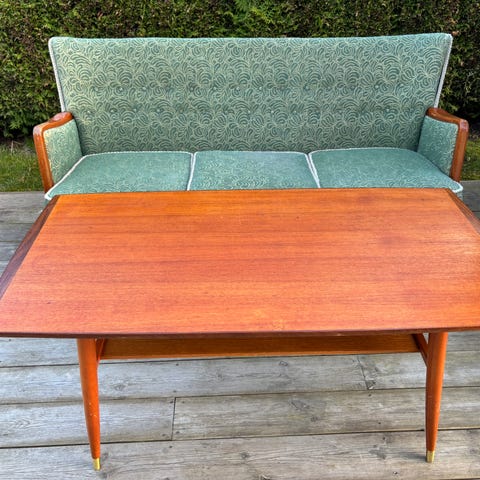 60-talls Rottingsofa med utskjæringer i gyllen velur trekk. Dunputer