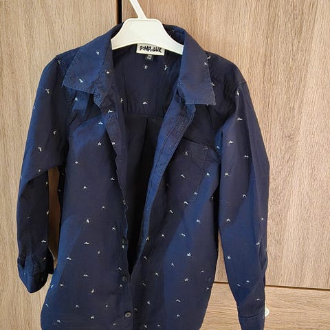 Seks skjorter, noen i str 110 og noen i 116. Fire av dem er fra Name-it, to av dem står det Tommy Hilfiger på, de har vi fått i en klespakke på Finn og jeg mistenker at de nok ikke er ekte merkevare.