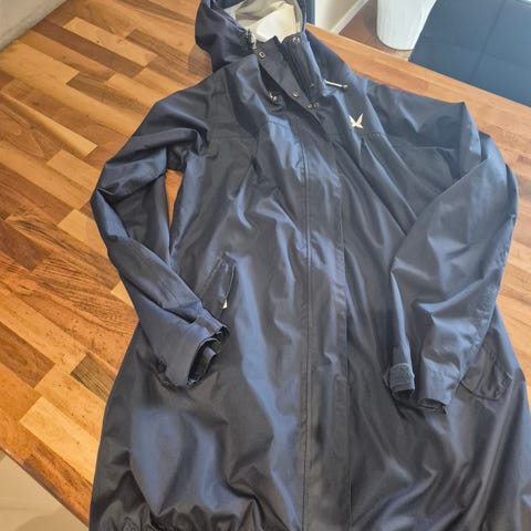 Fin parkas fra Kari Traa. Den er foret og lengre bak. Fin blå farge inne i jakken. Jakken er oker gul.