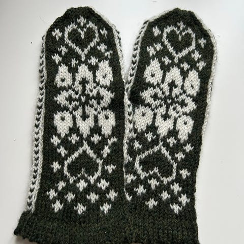 Hjemmestrikkede votter etter oppskriften Drip Mittens Mysize, men strikket litt lengere.