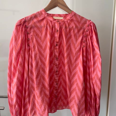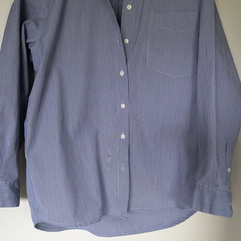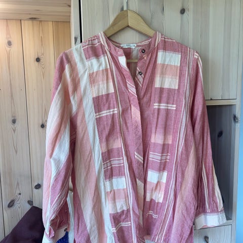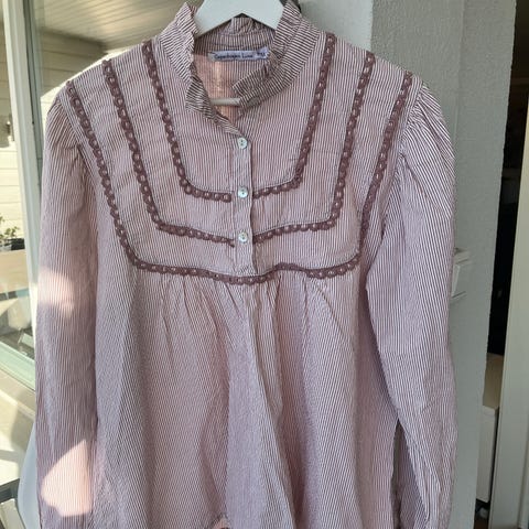 Pent brukt skjorte i hvite og oransje broderte striper. Størrelse S/M.