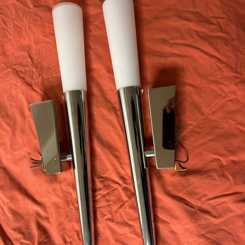 Selger to pent brukte vegglamper som har blitt brukt på soverom / soveromslamper. De har frostet glass og vært koblet rett inn i veggen, har derfor ikke bryter. Merket stemmer ikke i forhold til hva Finn foreslår, tror de er fra Daz light company. Hentes helst på Bogstad , men kan evt sendes på kjøpers regning og ansvar da jeg er redd for at de kan knuse . Selges samlet for 400