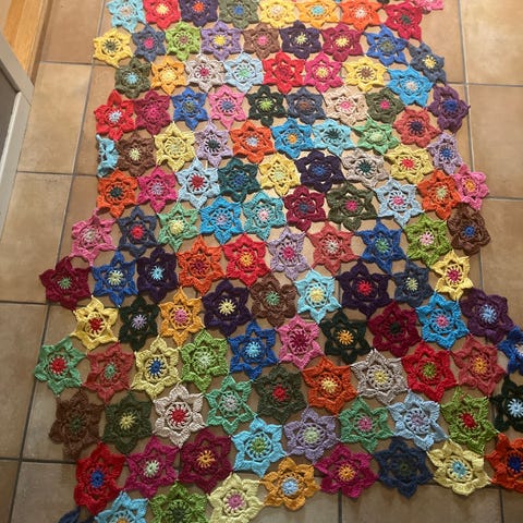 Mykt og lett pledd med glittertråder. Mål ca. 100 x 160 cm. Pleddet er heklet av meg og nytt.