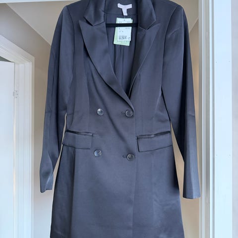 H&M festkjole i svart farge, størrelse S (EUR 38). Kjolen har dobbelspent front med knapper og detaljer i sateng på kragen. Designet for kvinner.