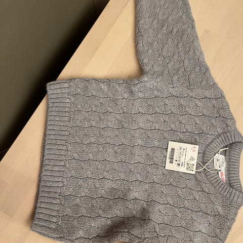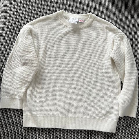 Zara genser i størrelse 104/4 år, unisex modell. Genseren er grå med svarte striper og laget av strikket materiale. Passer for barn.