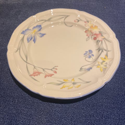290,- per kuvert. Blått og hvitt porselens servise med blomsterdekor. Inneholder kopper, skåler og tallerkener i porselen. Passer til servering av drikke og mat.