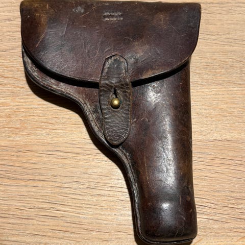Originalt militærhylster i svart lær, brukt under og etter 2. verdenskrig. Hylsteret har klassisk "full flap"-design med frontlomme for reserve magasin. Robust lær med tidstypiske sømmer og beslag