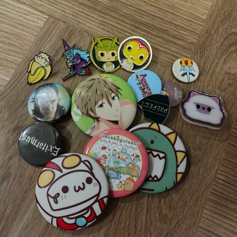 Sett med flere pins med ulike humoristiske motiver og tekst. Pinsene har forskjellige farger og design, og kan brukes til å feste på klær, vesker eller andre tekstiler for dekorasjon.