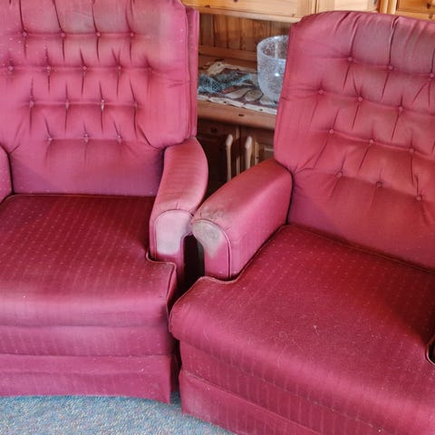 2 godt brukte og veldig behagelige reclinere i skinn gis bort. Integrert krakk.