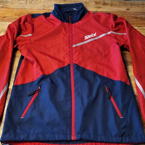 Swix skijakke i størrelse 164 for unisex. Jakken har farger i blått, rødt og hvitt, og er designet for ulike sportstyper.