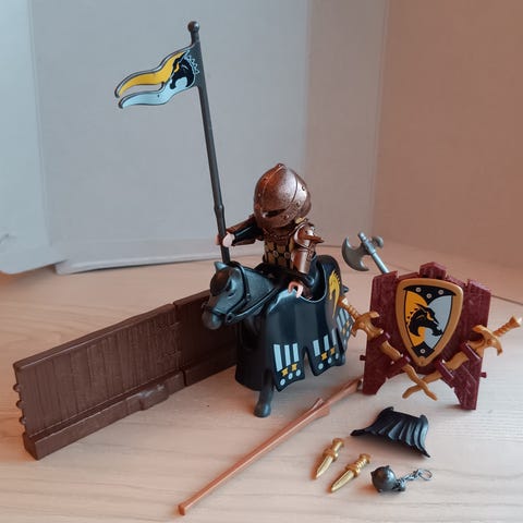 Pent brukt Playmobil Knights ridderfigur, hest, tilhørende tilbehør og orginalpakning. Passer for barn og kan brukes til rollelek og utvikling av fantasi.